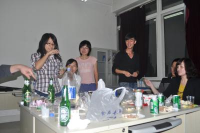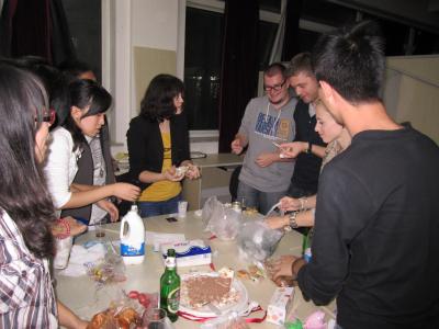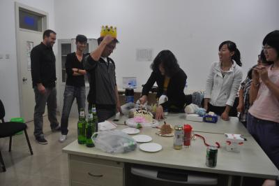 ...Unter "Party" verstehen die Chinesen wie wir inzwischen gelernt haben Essen gehen und Spiele spielen. Unser chinesische Freund war als er auf der Überraschungsparty ankam total gerüht und musste zu unserer Verwunderung fast weinen. Angeblich habe er so seinen Geburtstag noch nie gefeiert. Hier der Geburtstagstisch mit Geburtstagskuchen. Von uns gab es ein typisch deutsches Bier mit passendem Glas und deutsche Süßigkeiten...