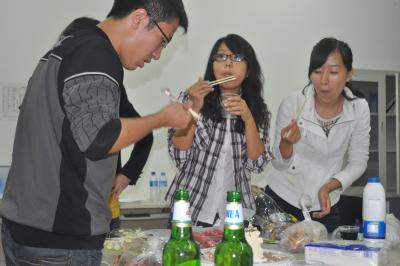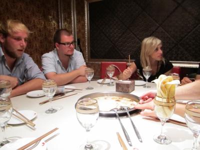 ...Sogar der Kuchen wird hier mit Stäbchen gegessen. Die Chinesen machens vor, und wir versuchen unser Bestes, allerdings gings mit den Fingern dann doch leichter...