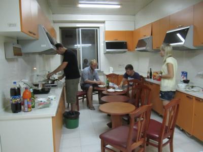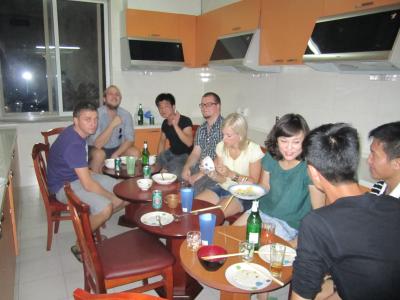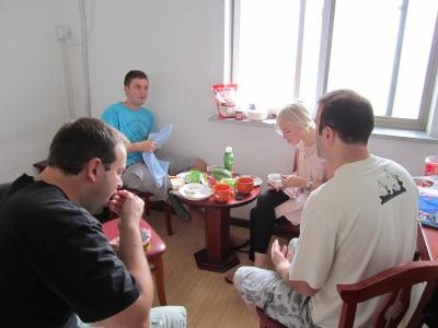...Vorhin haben wir dann mal zur Abwechslung gekocht und die Chinesen zu uns eingeladen. Wir mussten sie unten am EIngang unseres Hotels abholen. Da man nur als Gast/ Bewohner das Gebäude betreten kann. Dann gab es Pasta mit Auberginen und Tomaten, Bratkartoffeln mit Zwiebeln und Pilzen und "Armen Ritter". Für uns endlich mal wieder etwas Einheimisches. Für die ein Schock an Kohlenhydraten. Sie schienen es aber halbwegs zu mögen. Nachdem wir den Whiskey rausgeholt haben, haben wir ihnen dann gleich mal etwas Plattdeutsch beigebracht. So ähnlich muss sich unser Chinesisch auch anhören. Aber endlich konnten wir mal über ihre Aussprache lachen, und nicht umgekehrt...