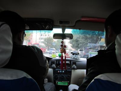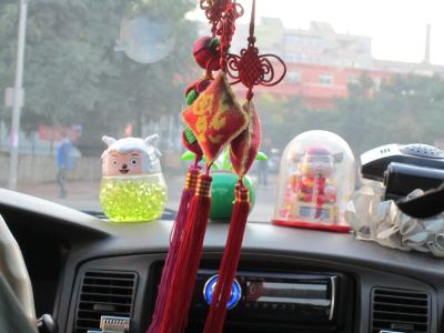 ...Mit dem Taxi ging es dann zurück zum Unigelände. Hier in China ein Taxi zubekommen ist echt nicht einfach. Dafür aber sehr preiswert. Eine 20 minütige Fahrt kostet maximal 4 Euro. Freie Taxis sind an dem roten Licht in der Frontscheibe zu erkennen. Allerdings muss man aber auch seine Ellenbogen bereit halten, da diese hart umkämpft sind. Wie so oft hatte auch dieser Taxifahrer eine Handydauerverbindung und eine Vorliebe für chinesischen Kitsch...