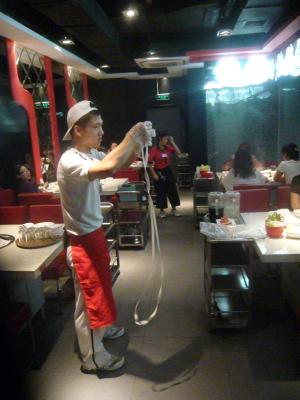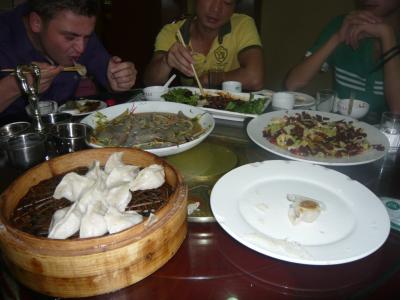 ...Wie schon bei unserem ersten Essen, bekamen wir sofort einen Extraraum zugewiesen, obgleich keiner einen Tisch reserviert hatte. Serviert wurden typisch chinesische Mantous, gefüllte Teigtaschen mit Gemüse, Tomaten und Ei, oder Fleisch. Dazu gabs Salat. An Schärfe und Knoblauch (leckerlecker) wird nicht gespart...