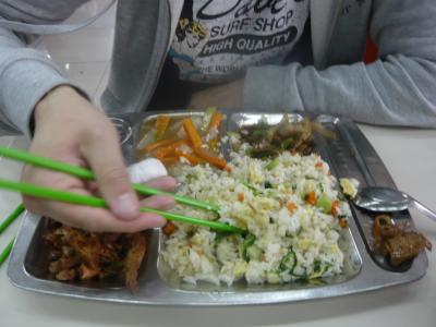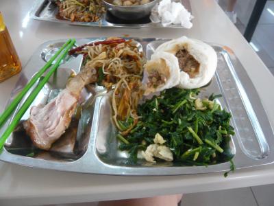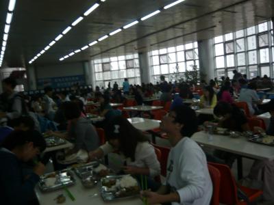 ...Nach zwei Unterrichtseinheiten und insgesamt 3h ist dann ab 11.40 Uhr Mittagspause. Dann heißt es schnell auf in die Mensa, denn Essen wird nur ca. 30min angeboten. Insgesamt gibt es hier drei Mensen. Unsere bietet so ziemlich alles an "Chinesisch- Kulinarischen Köstlichkeiten" auf drei Etagen. Unsere chinesischen Freunde haben uns allerdings dringend von der untersten abgeraten. Das will dann schon etwas heißen. In die Mensa kann man zu jeder Mahlzeit. Scheinbar wird das Essen morgens zubereitet und dann bis abends angeboten...